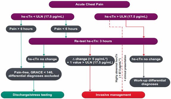 1.依據2012年ESC/ACC心臟學會指引之第三次心肌梗塞共識文件指出,送至急診出現胸痛、或其他缺血症狀患者,心肌梗塞診斷標準為:偵測到心肌生物指標濃度上升及/或下降(最好以Troponin為依據),且至少有一個數值大於第99